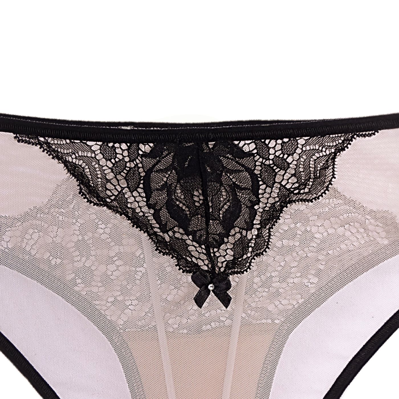 Секси тюлени бикини- красиво съчетание от бежов, фин, еластичен тюл и черна, красива дантела с флорални мотиви. Завършени са с тънък, черен плосък ластик и деликатен бляскав детайл върху задната част. Силният контраст между цветове и материи придават загадъчно еротично излъчване на този модел бельо.